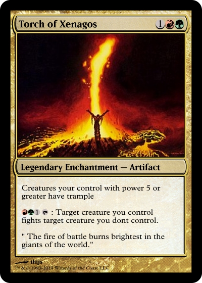 Past bij Xenagos omdat hij je beesten groot maakt en ze daarom snel trample krijgen van zijn wapen. Hier is het grootste probleem met de ability van xenagod gelijk opgelost, dat zijn gigantische beesten makkelijk gechumped konden worden. Daarnaast heeft het wapen een fight ability die ook goed samenwerkt met de grotermakende ability van Xenagod omdat jou beesten dan ongeschonden uit het gevecht kunnen komen.