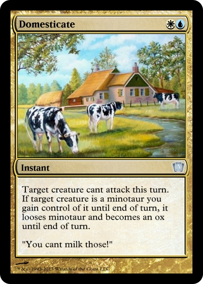 Gedomesticeerde beesten zijn lang niet zo aggresief als hun wilde makkers en ze zullen dus niet gauw aanvallen. Bij minotaurs geld dit extra, als ze gedomesticeerd worden worden het makke lammetjes euuh koetjes. Speltechnisch een manier om dikke beesten een beurt af te houden en een grote upside tegen minotaurs.